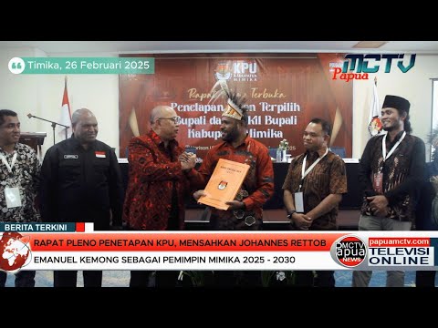 Timika, papuamctv.com - Komisi Pemilihan Umum (KPU) Kabupaten Mimika melalui Rapat Pleno Terbuka Penetapan Calon Terpilih Bupati dan Wakil Bupati Kabupaten Mimika menetapkan secara sah pasangan Johannes Rettob – Emanuel Kemong (JOEL) sebagai Bupati dan Wakil Bupati Kabupaten Mimika, periode 2025-2030.